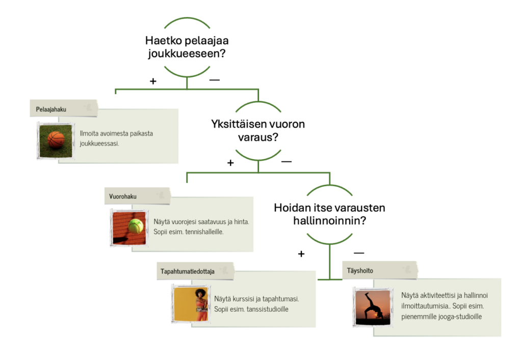 Vuorohaku – vuoroissa varattavien lajien kevyt hakualusta. Kehitämme ominaisuutta, jossa esimerkiksi sulkapallohallin suostumuksella näytämme kaikkien alustallemme kuuluvien vuorot ja hinnat haettuna ajankohtana haetulta alueelta. Varaukset tapahtuvat palveluntarjoajan omilla nettisivuilla